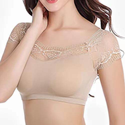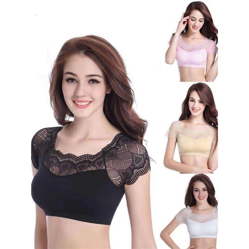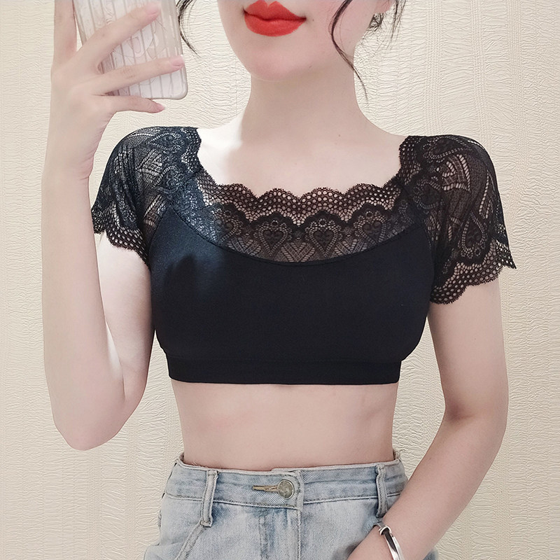 吊带裙内搭打底衫女蕾丝短袖带胸垫网纱一字假领半截裹胸背心上衣