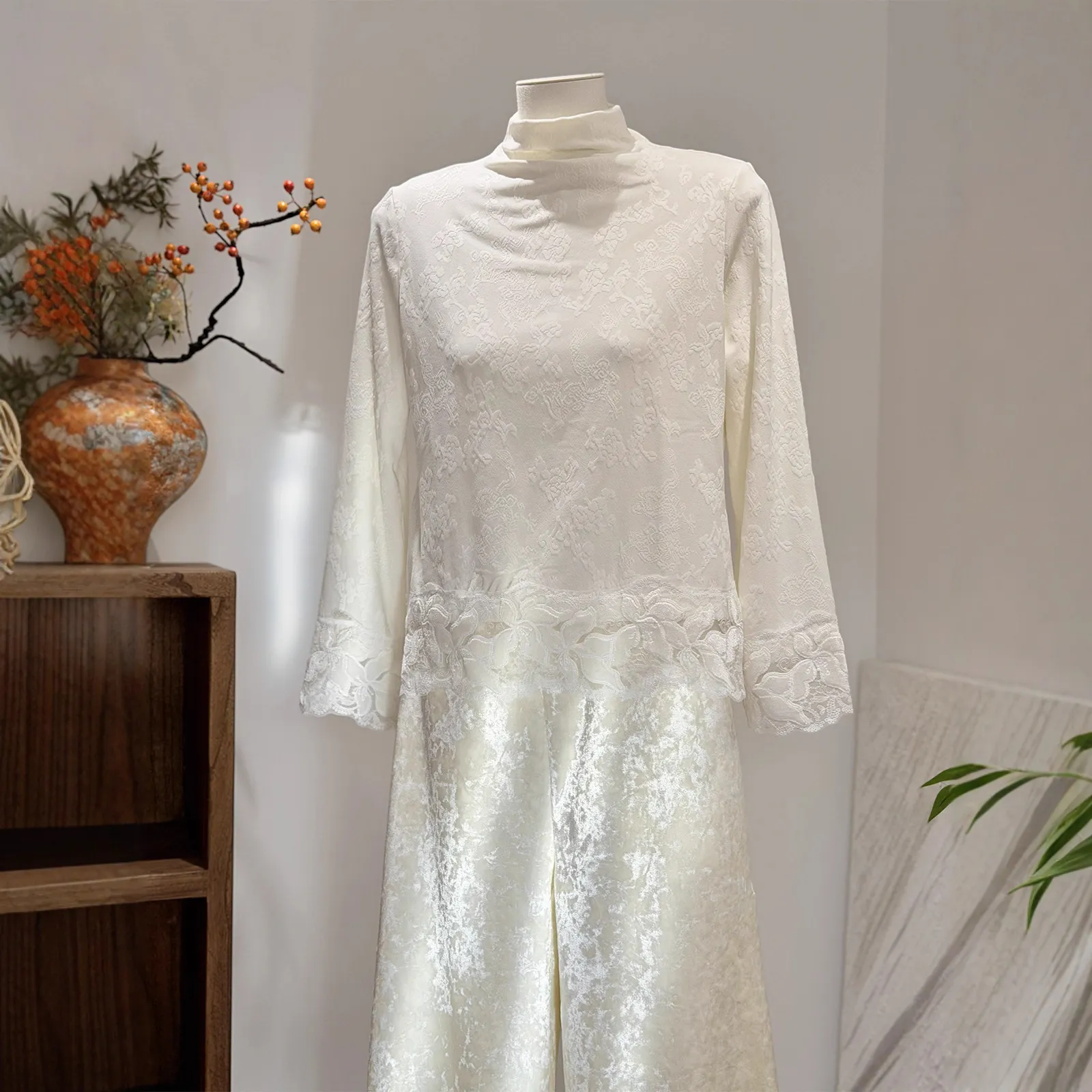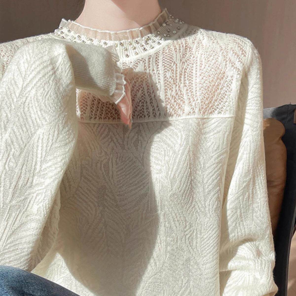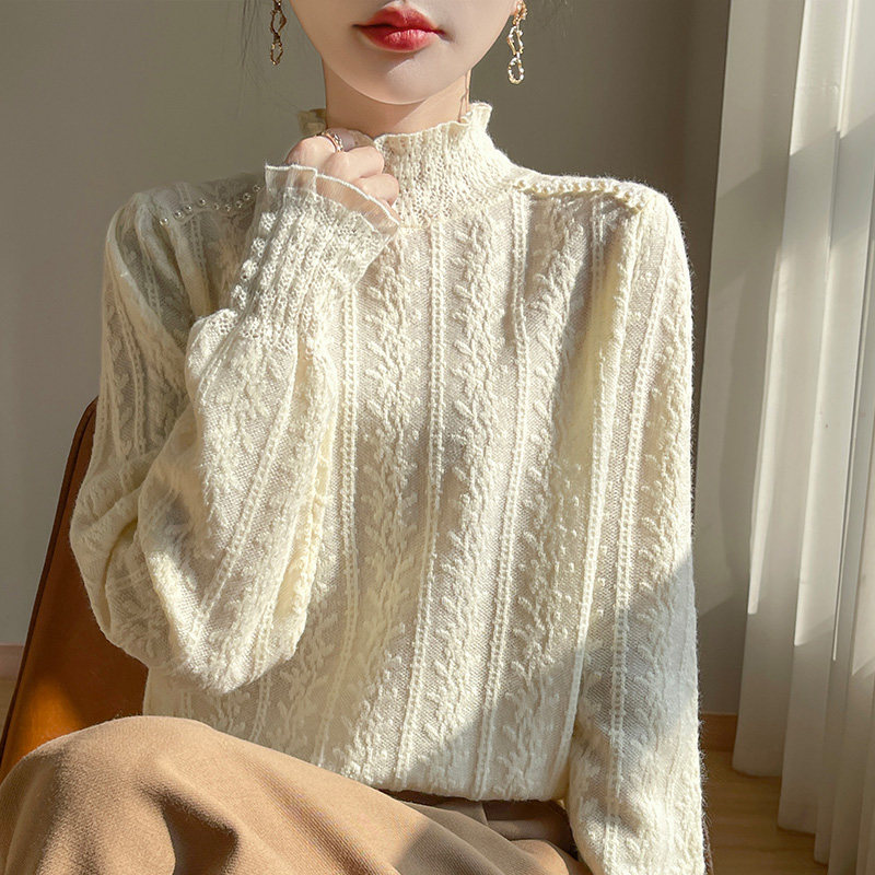 2024秋冬新款优雅高级感针织衫女蕾丝木耳边打底衫半高领毛衣内搭