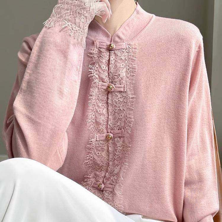 中国风立领打底衫女蕾丝拼接盘扣宽松长袖外穿气质百搭针织1225e