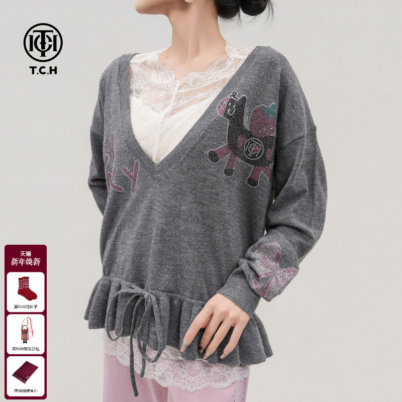 TCH烫钻萌马抽绳荷叶边V领针织衫女蕾丝内搭气质套装T75D07E5033