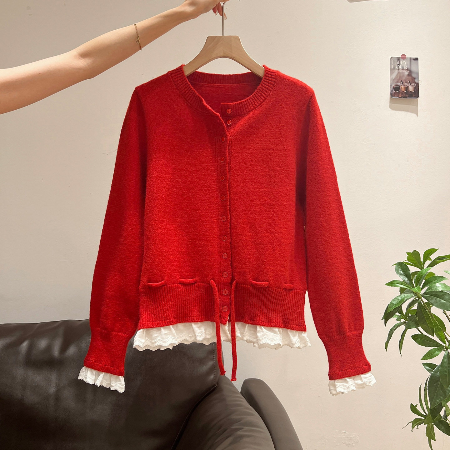 红色抽绳针织衫女蕾丝花边假两件长袖T恤女秋冬季穿搭单排扣上衣