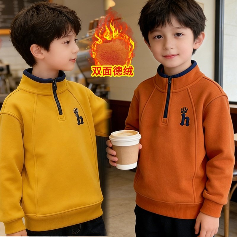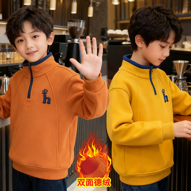 男童加绒卫衣冬装新款中大儿童加厚一体绒打底男孩半开扣立领上衣
