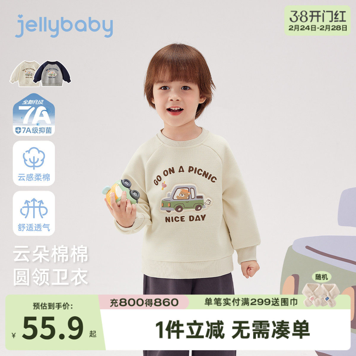 [7A抗菌]宝宝卫衣学院风春季款小车中童上衣小熊印花男童衣服儿童