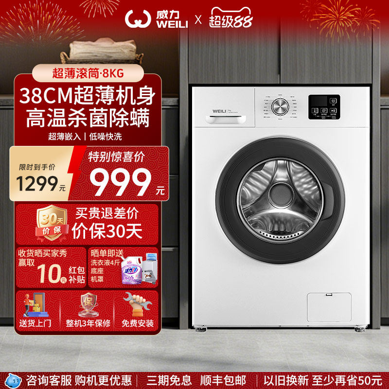 [国家补贴]威力超薄滚筒洗衣机8公斤40cm全自动家用小型公寓1016
