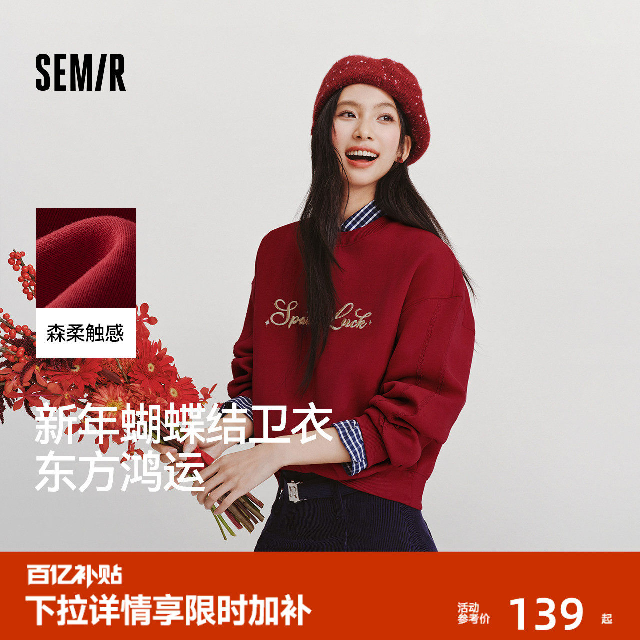 森柔|森马卫衣女春蕾丝蝴蝶结字母宽松红色2026新款新年红色上衣