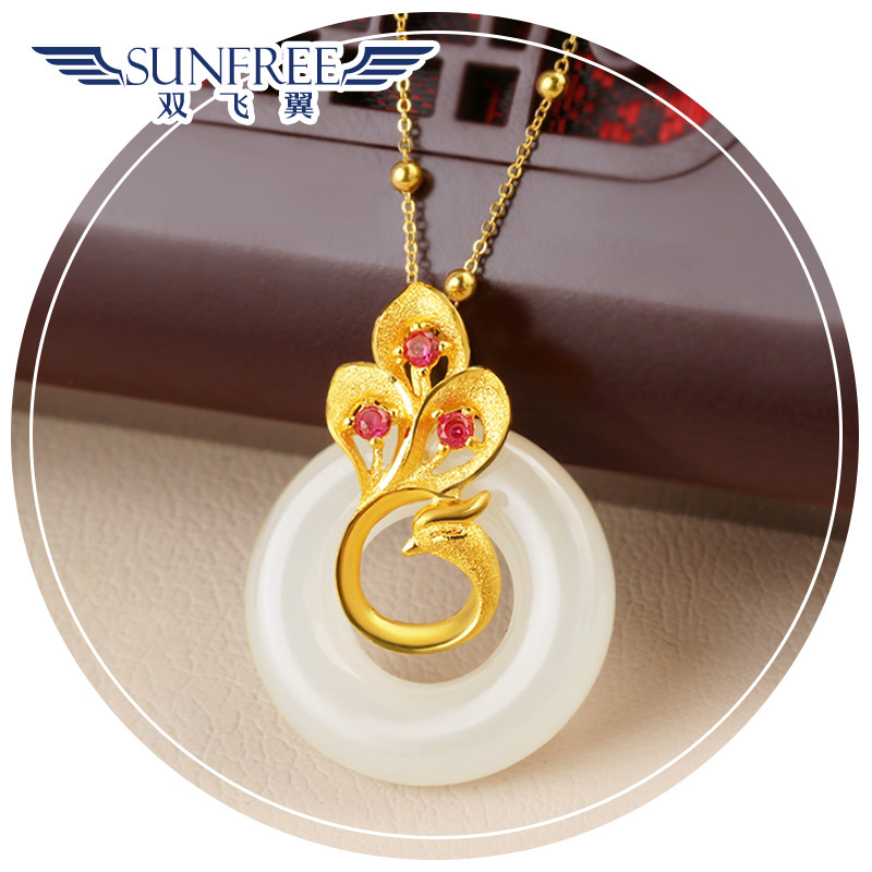 黄金足金999金镶玉和田玉孔雀吊坠女款平安扣项链挂坠首饰礼物