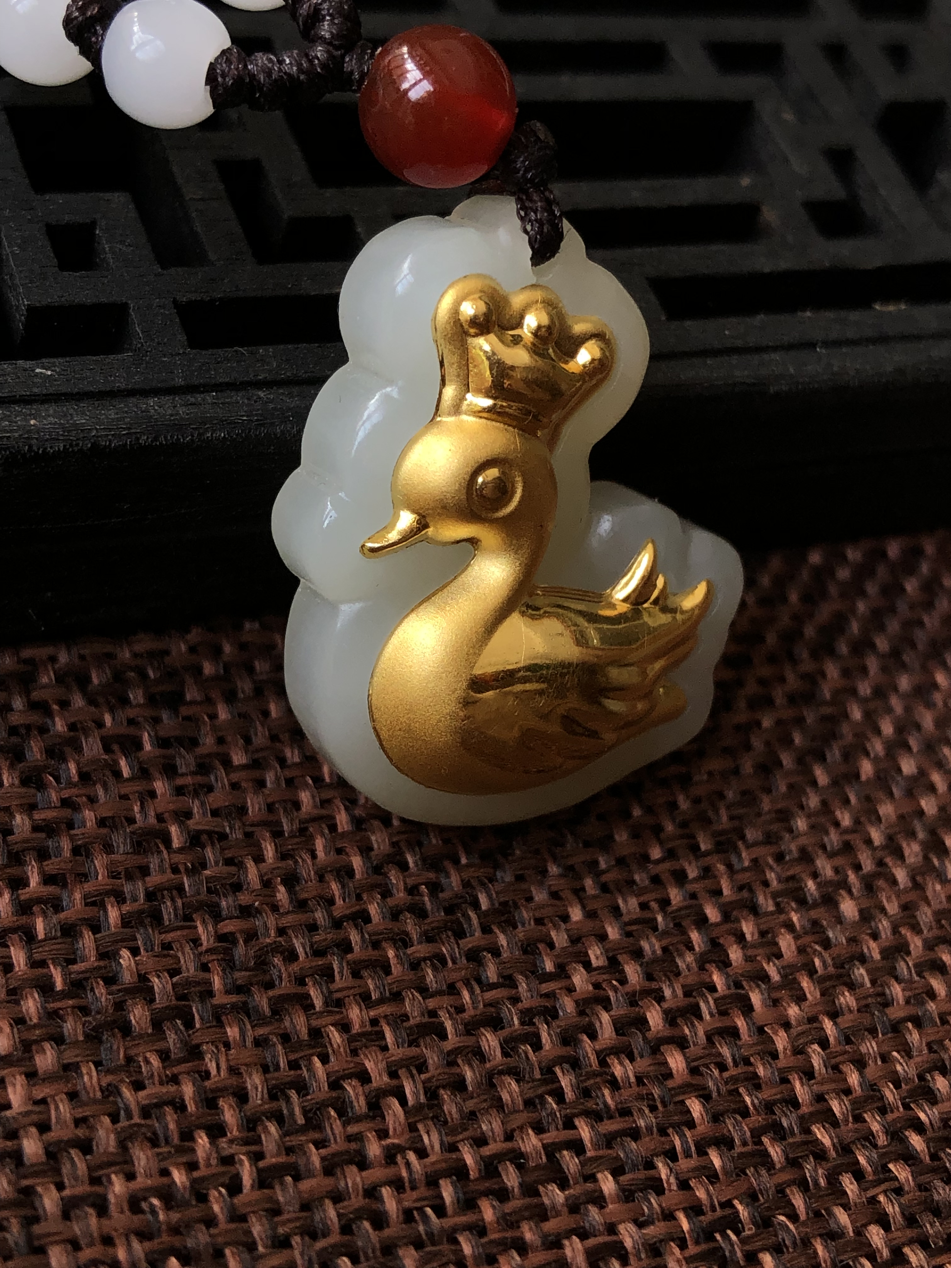 天然和田玉小天鹅吊坠女款金镶玉挂件足金玉石玉佩项链附证书绳子