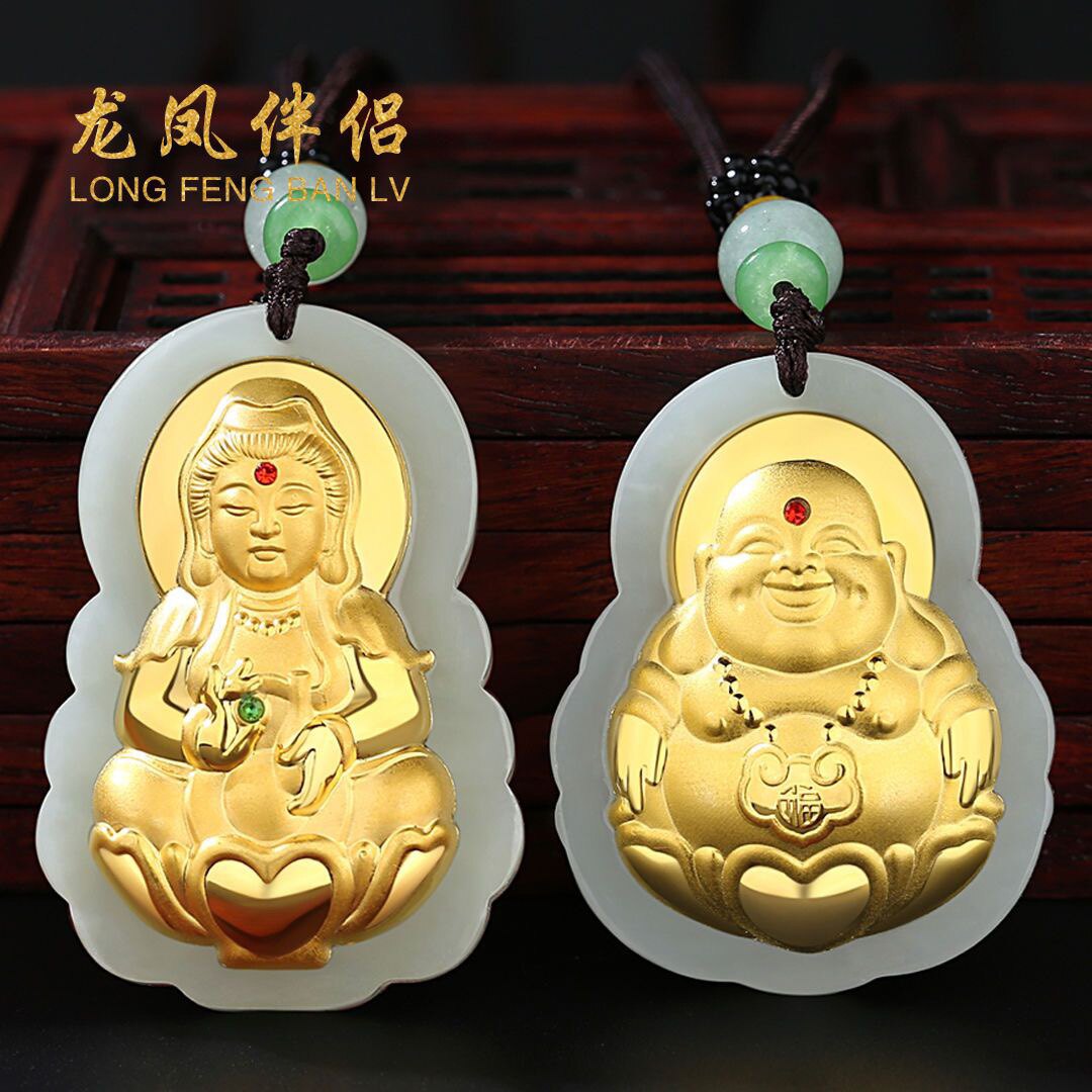 足金镶和田玉笑佛观音情侣男女款吊坠赠送银扣项链绳子买一赠送三