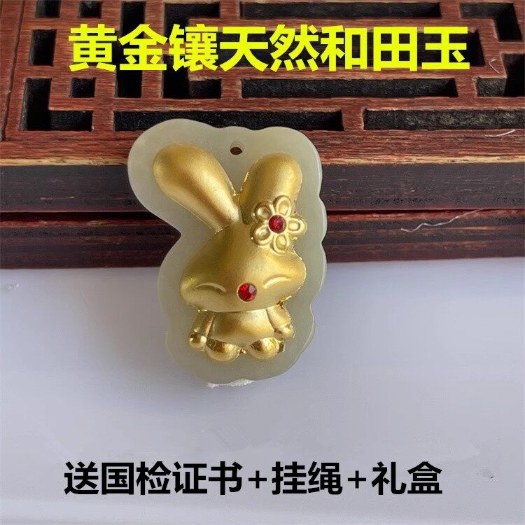 黄金足金镶嵌天然和田玉兔子金镶玉项链玉佩吊坠挂件女款生日礼物