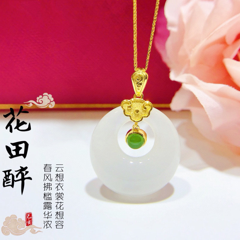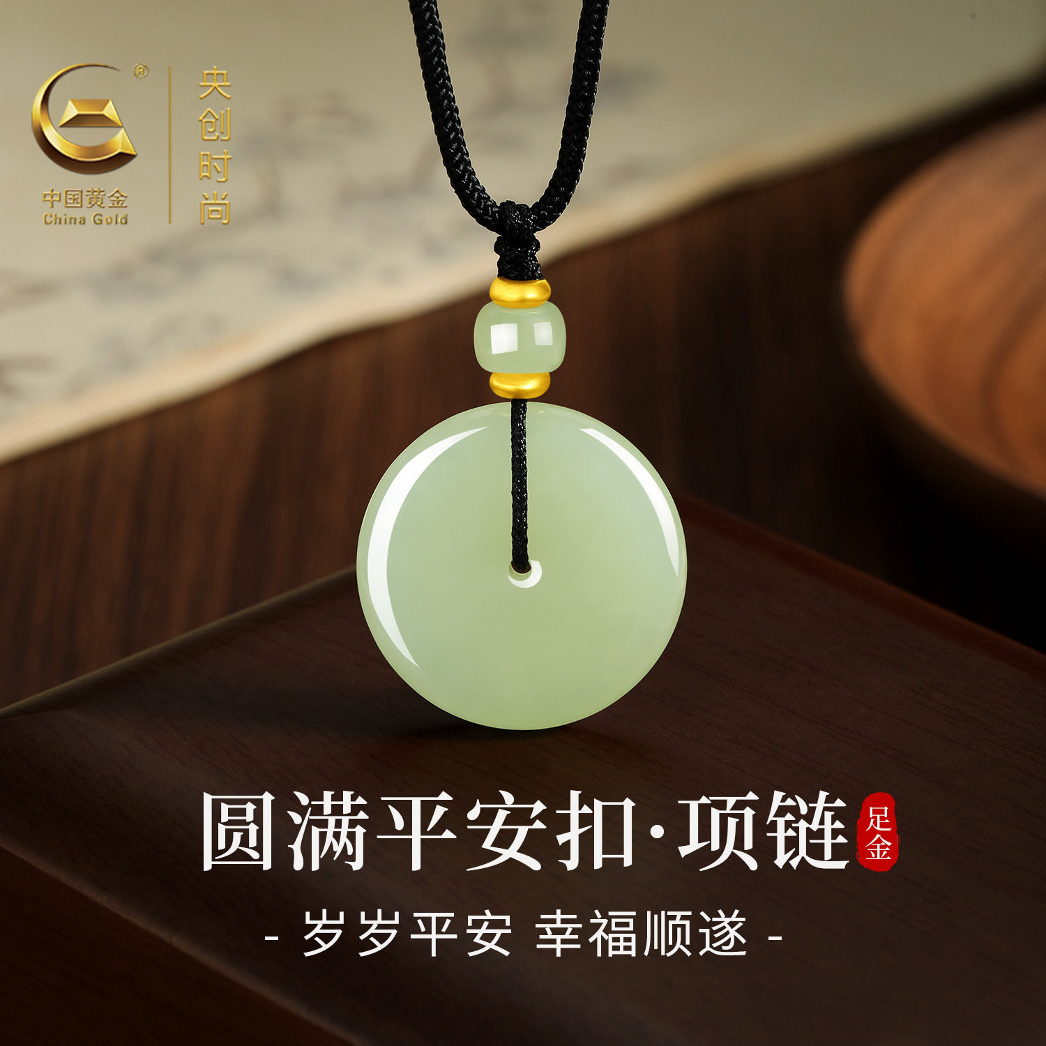 999足金金镶和田玉平安扣吊坠纯金碧玉挂件女款黄金项链送礼首饰