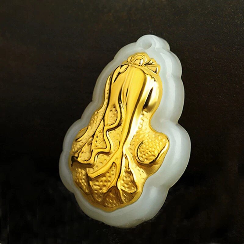 金镶玉和田玉观音佛吊坠 男女款足金镶嵌白玉牌玉佩 情侣玉吊坠