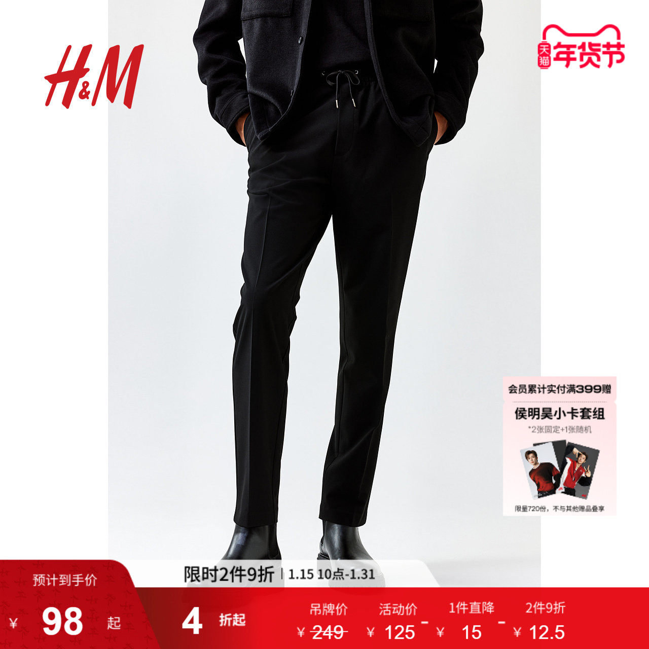 HM男装休闲裤冬季简约松紧带合身黑色长裤慢跑裤1195936