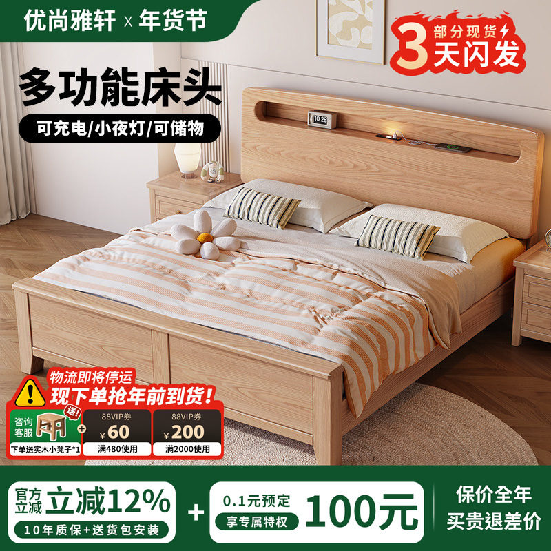 优尚雅轩白蜡木实木床双人床工厂直销主卧1.8米储物床北欧原木床