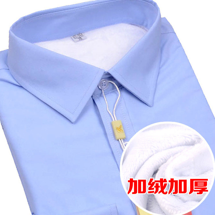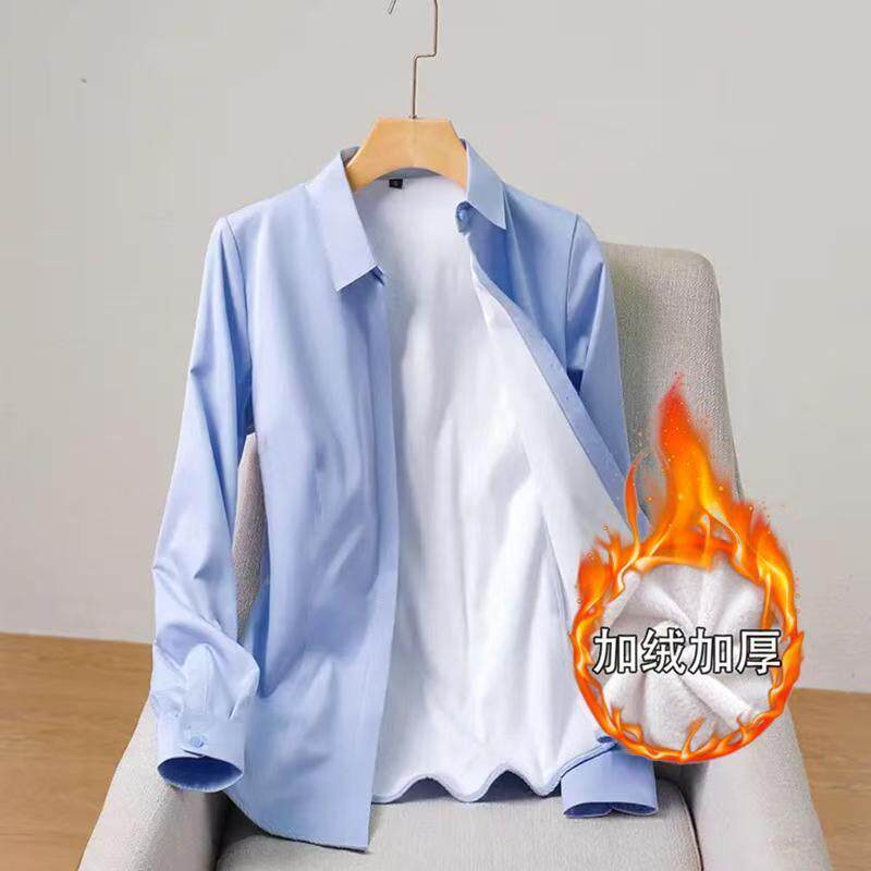 加绒职业装蓝色衬衫女秋冬长袖一体绒修身工装保暖白衬衣女工作服