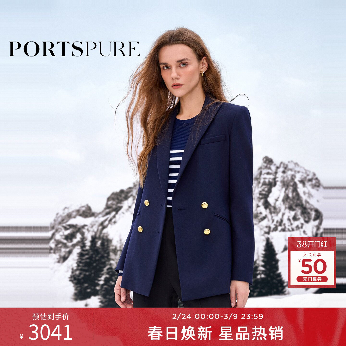 宝姿PORTSPURE女装秋冬优雅双排扣中长款收腰修身毛呢西装外套女