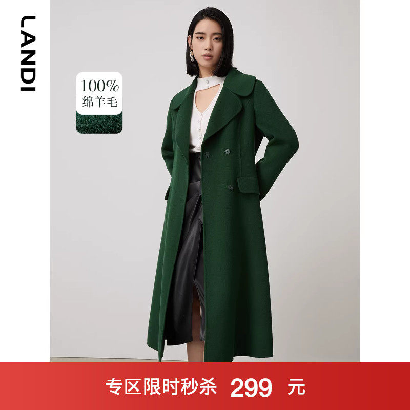 LANDI收腰中长款毛呢外套女新款深绿色冬季大翻领修身羊毛大衣