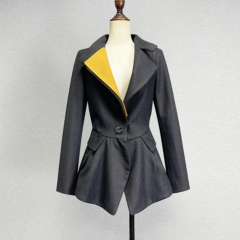 品牌折扣黑色羊毛呢外套女欧美风收腰修身显瘦单排扣拼色气质上衣
