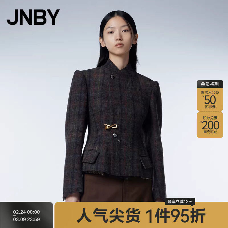 JNBY/江南布衣秋冬毛呢西装外套女复古格纹修身立领收腰通勤西服