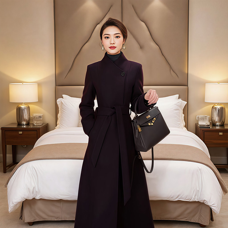 双面羊绒大衣女紫色反季长款过膝修身收腰减龄羊毛呢外套2025新款