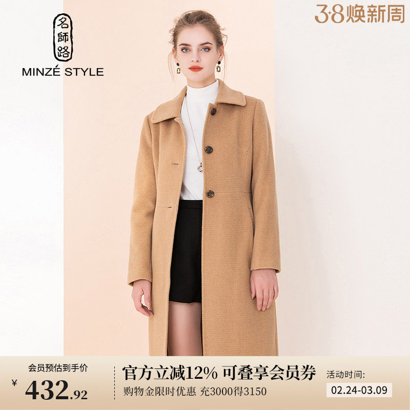 名师路长款收腰羊毛大衣冬季新款女毛呢外套娃娃领单排扣修身通勤
