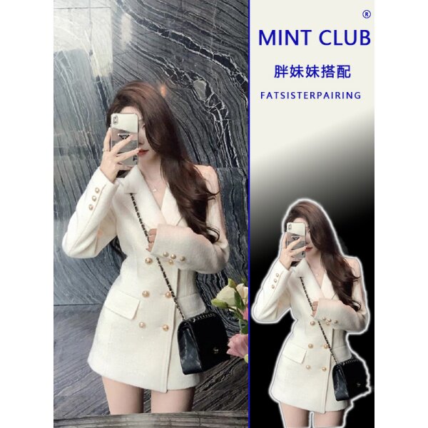 大码胖MM法式小香风翻领收腰修身毛呢外套女百搭开叉半身裙两件套