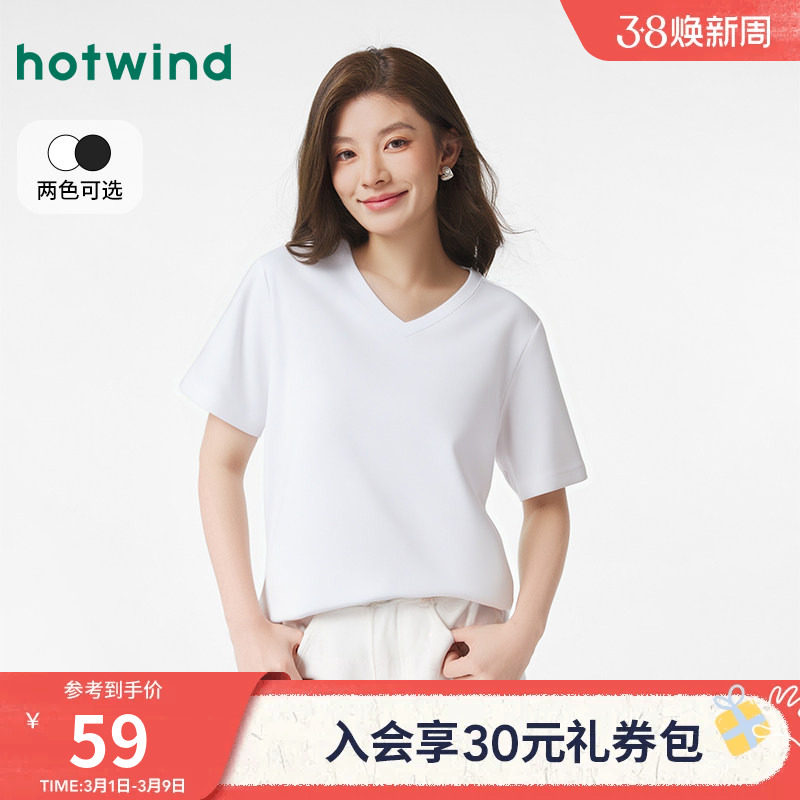热风女士短袖t恤上衣V领白色打底衫2026年春季新款黑色修身短袖T
