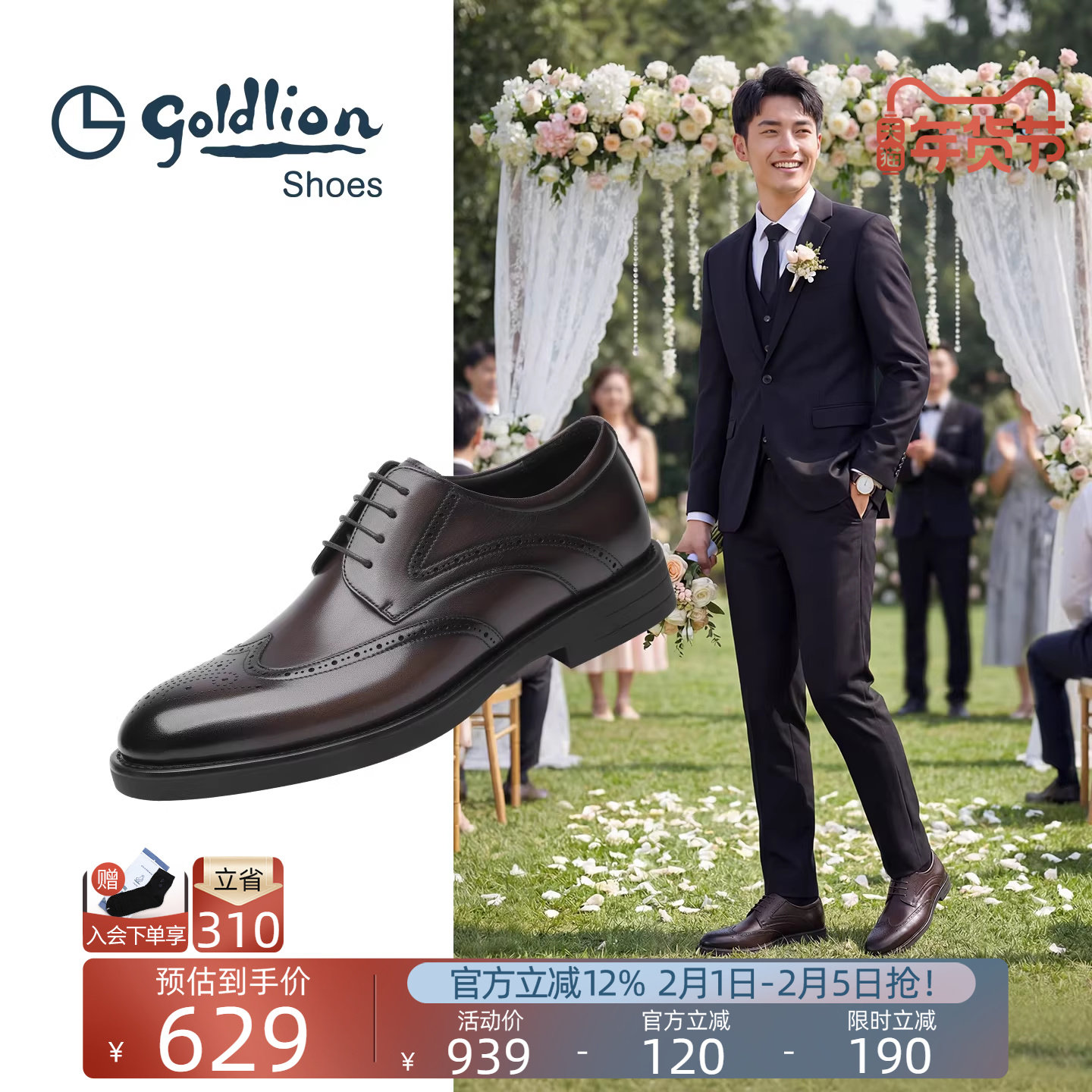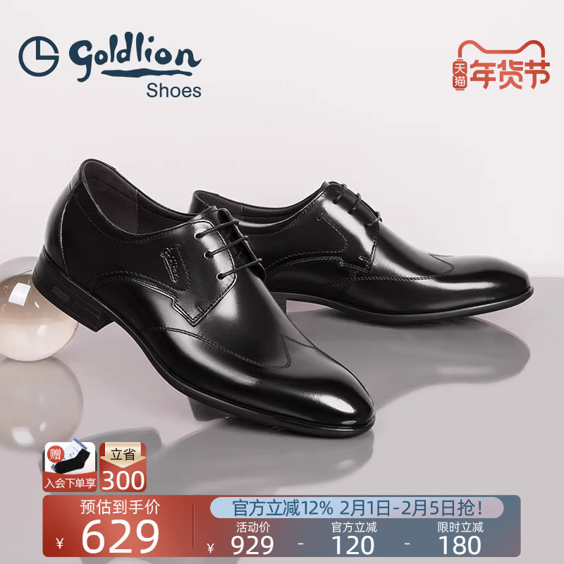 Goldlion皮鞋2025新款时尚男鞋真皮商务正装布洛克鞋西装新郎婚鞋