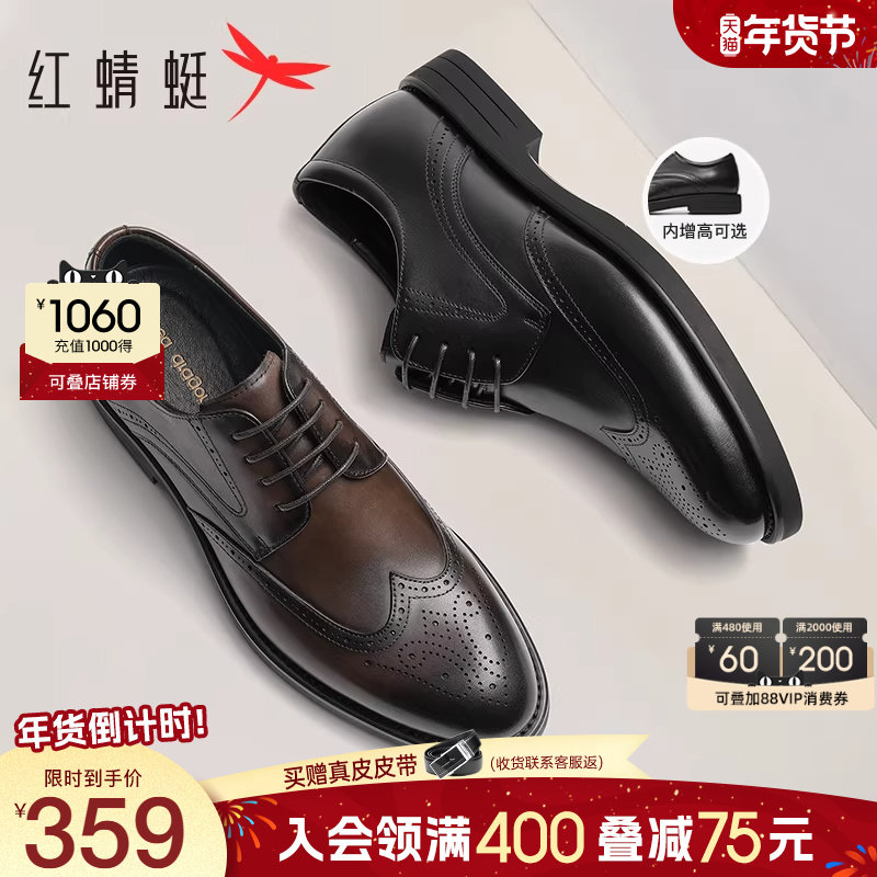 红蜻蜓黑骑士皮鞋男春秋新款真皮布洛克男士商务增高结婚新郎鞋男