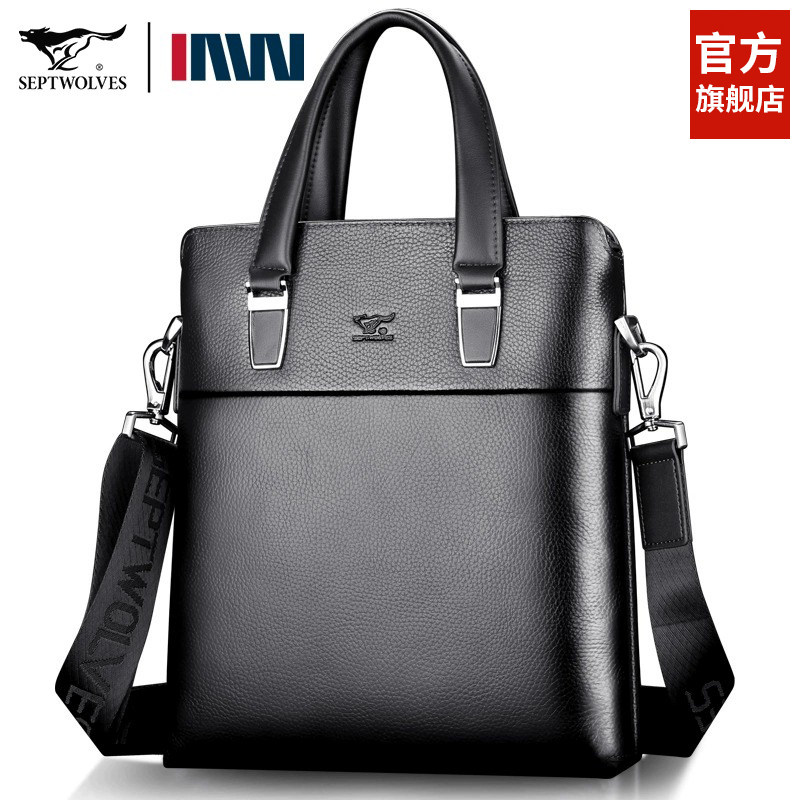 七匹狼单肩包男竖款公文包商务真皮手提包高档大容量头层牛皮男包