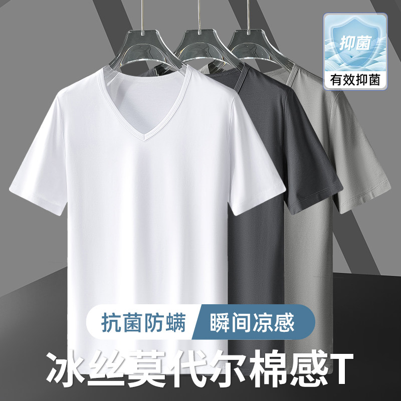 3件装】莫代尔短袖t恤男v领纯色白色冰丝光棉速干抗菌半袖打底衫