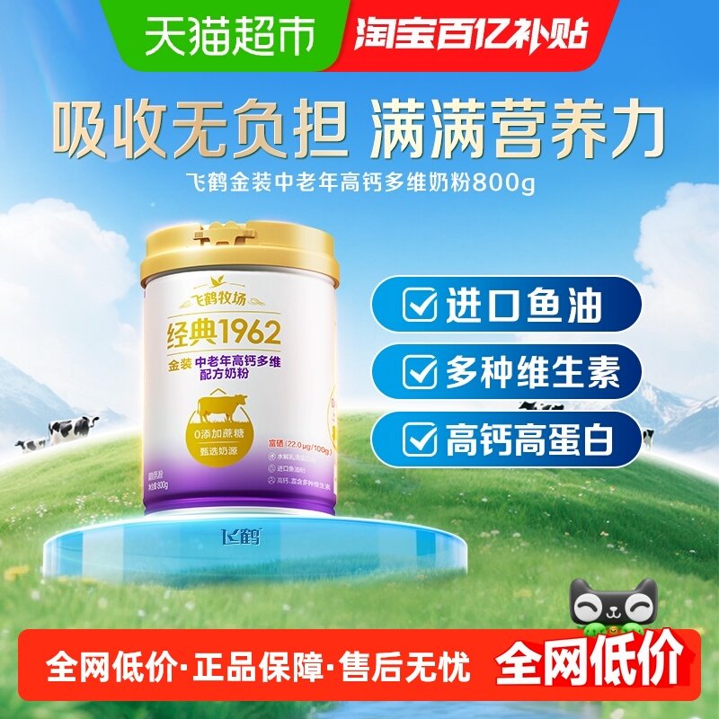 飞鹤金装1962中老年奶粉高钙进口鱼油成人800g*2罐营养奶粉生牛乳