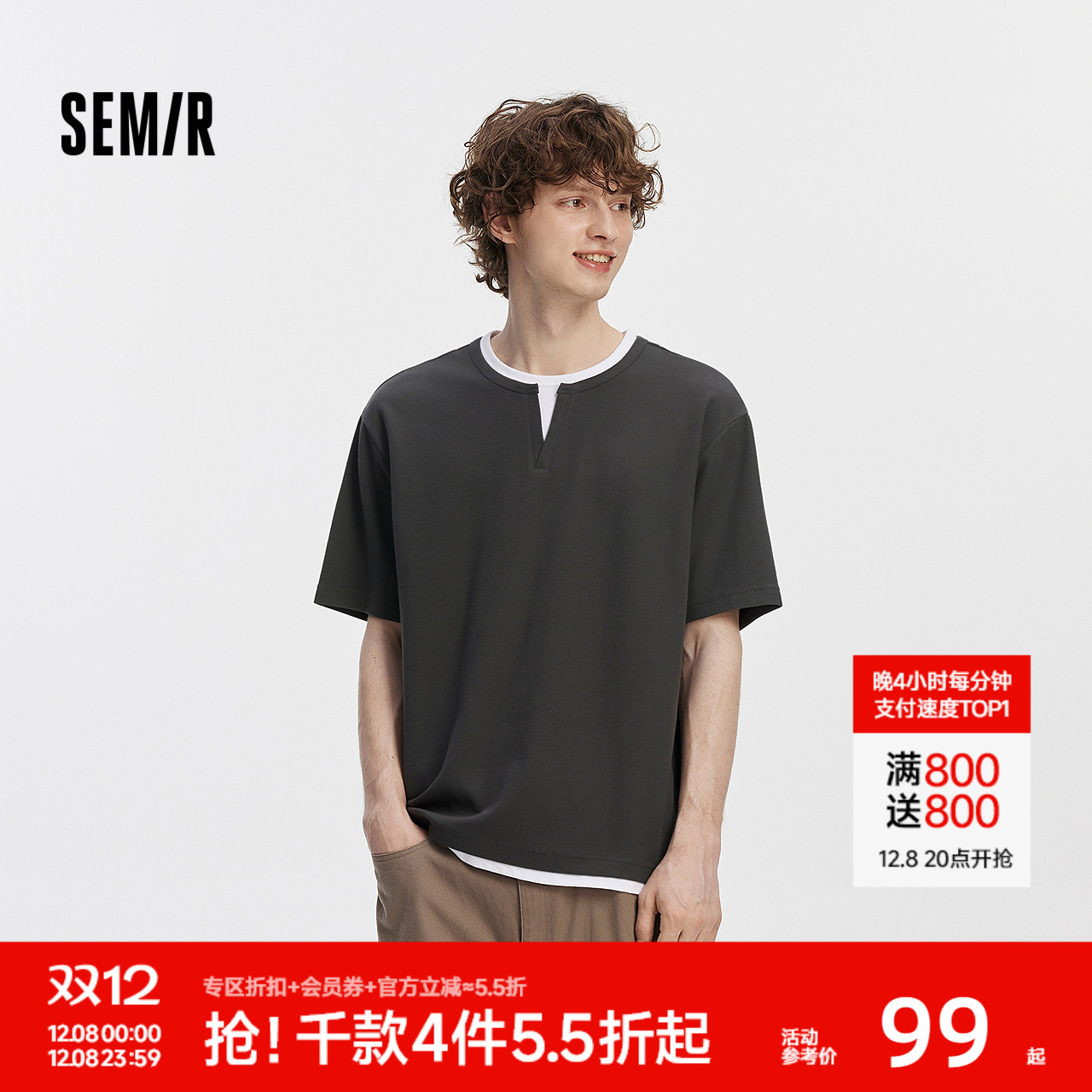 [商场同款]森马短袖T恤男V领假两件上衣华夫格2025新款夏季拼色潮