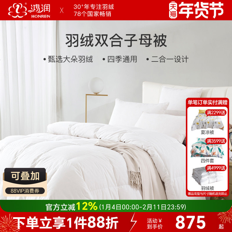鸿润家纺子母被四季通用70%白鸭绒全棉磨毛学生羽绒被冬春秋夏被