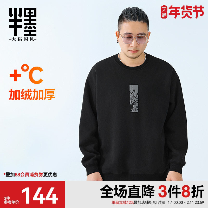 半墨大码男装卫衣男圆领冬季新款加绒简约加肥加大潮胖子套头外套