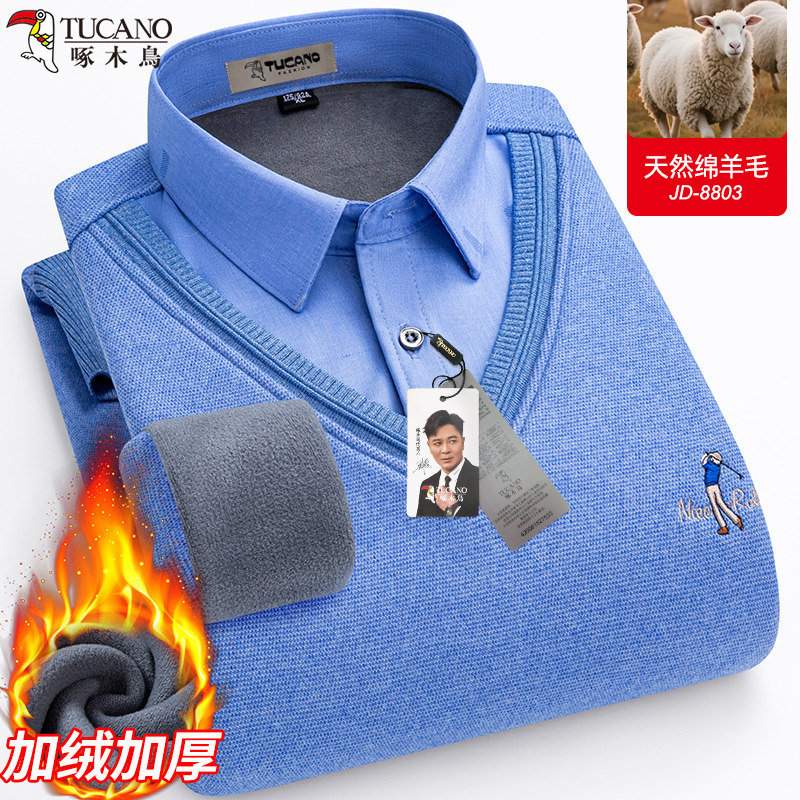 啄木鸟冬季男士休闲保暖套头针织衫中老年父亲爸爸装加绒长袖衬衫