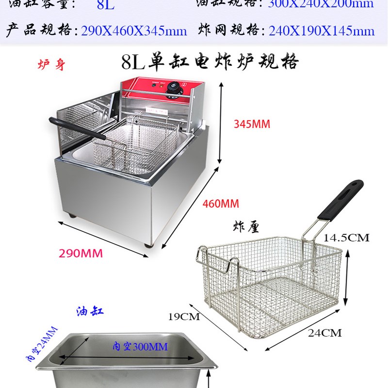 250度油炸锅8L大容量炸鸡油炸机商用加厚不锈钢电炸炉高温发热管