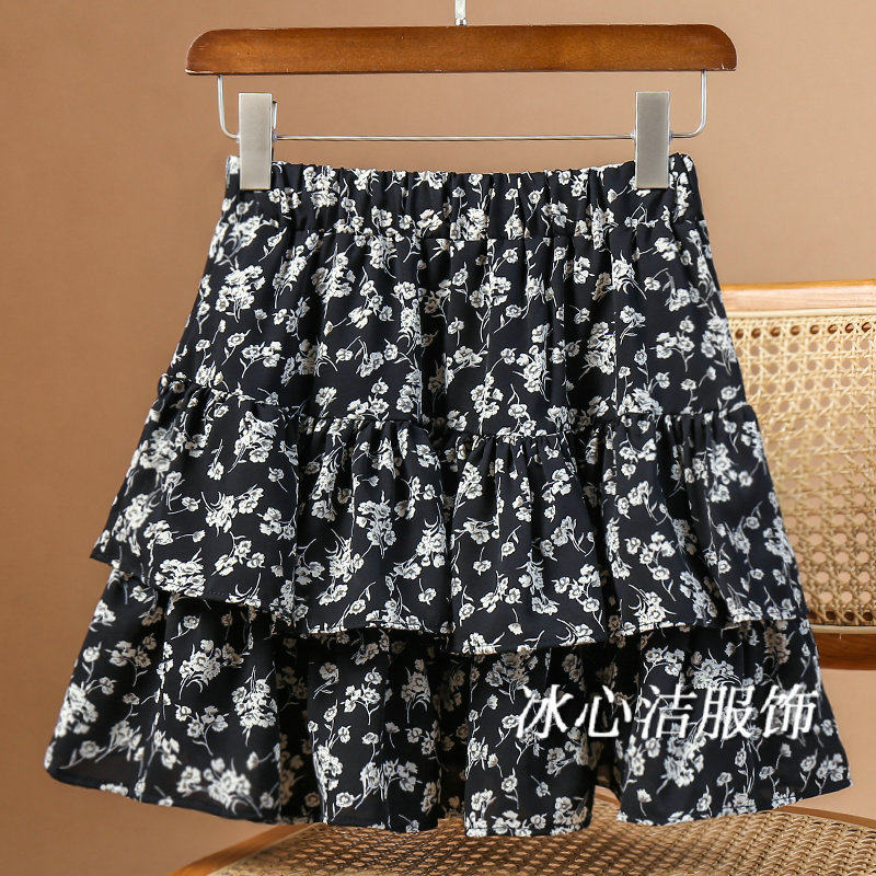 黑色碎花雪纺荷叶边短裙半身裙女夏季2024新款高腰显瘦裙子蛋糕裙