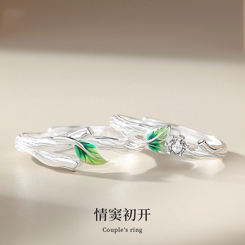 s925银情窦初开情侣戒指男女一对异地恋小清新指环创意绿叶对戒