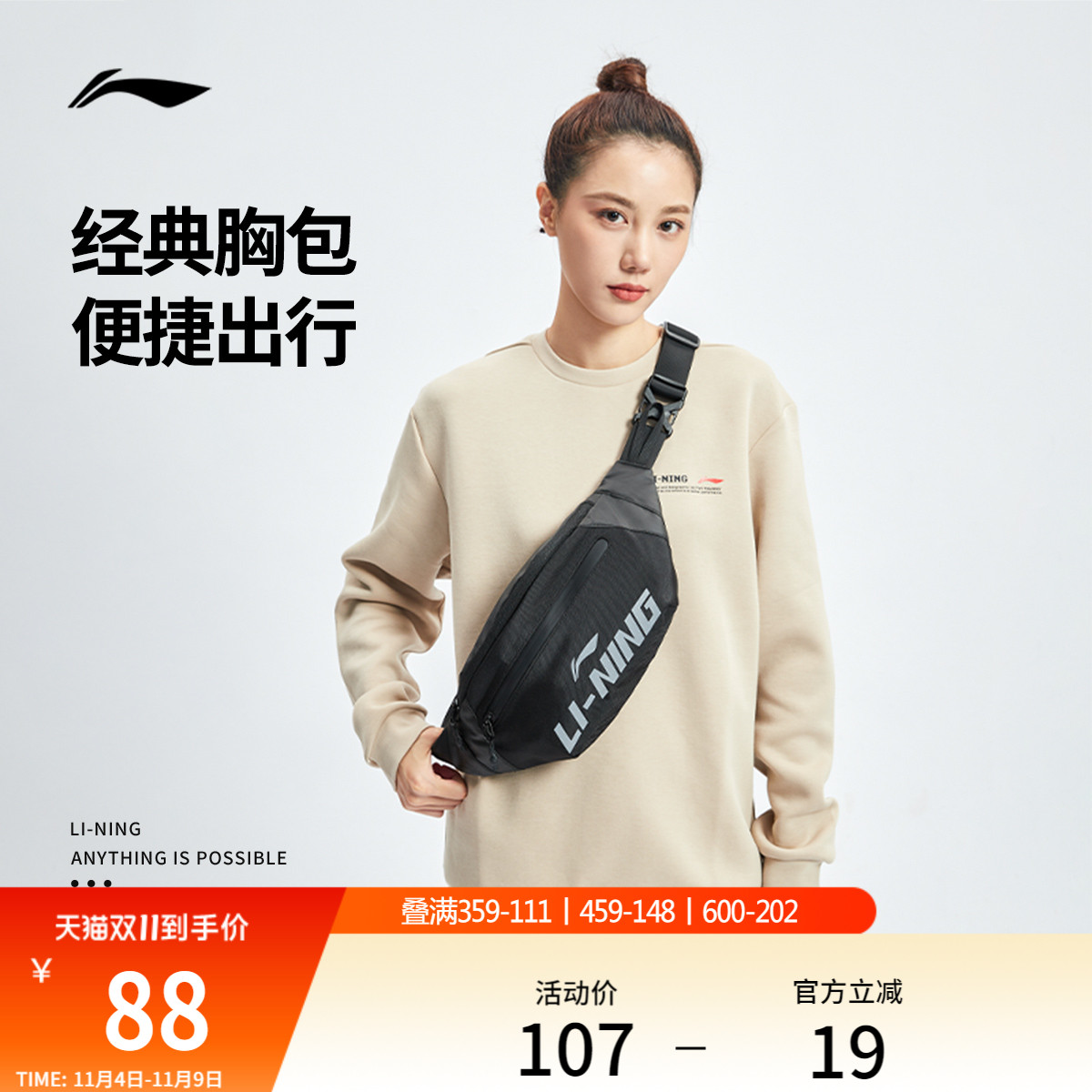 李宁腰包斜挎包男士女款轻便多功能胸包黑色时尚休闲运动单肩包包