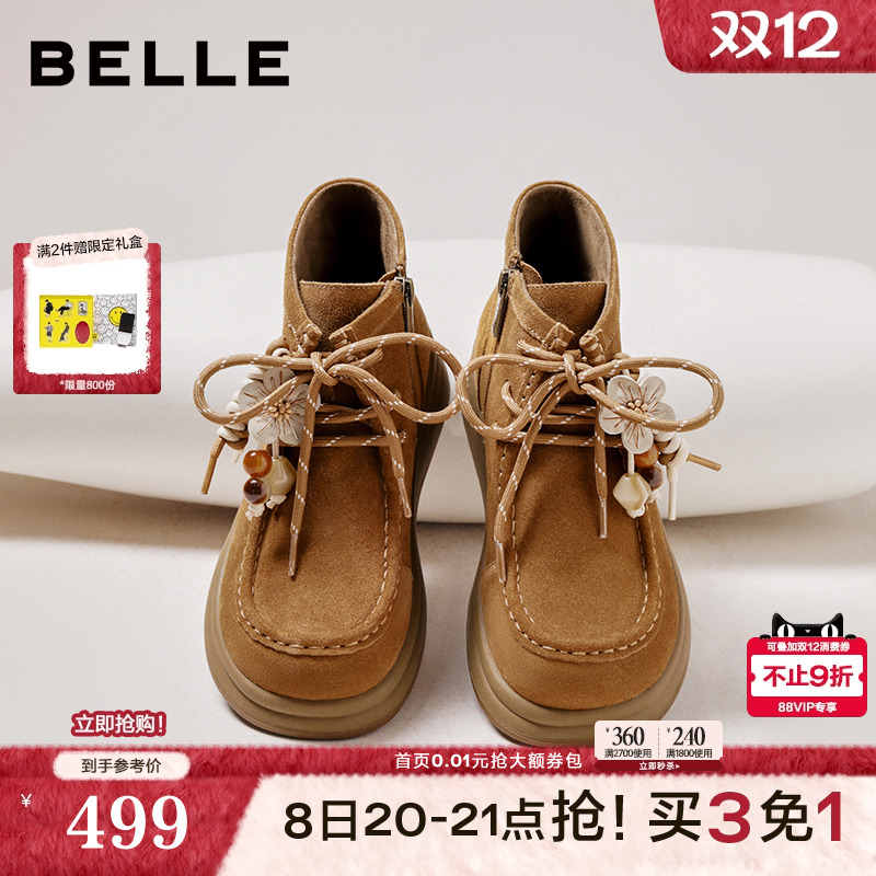 百丽Belle女鞋子厚底弹力靴女24冬冬季粗跟短靴反绒面子3MC61DZ4