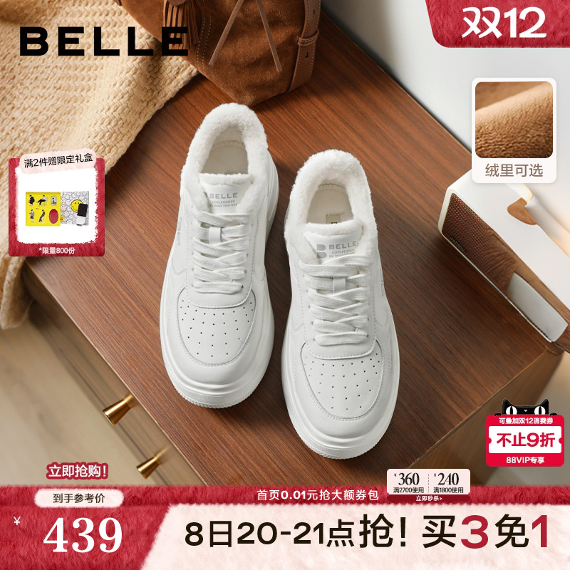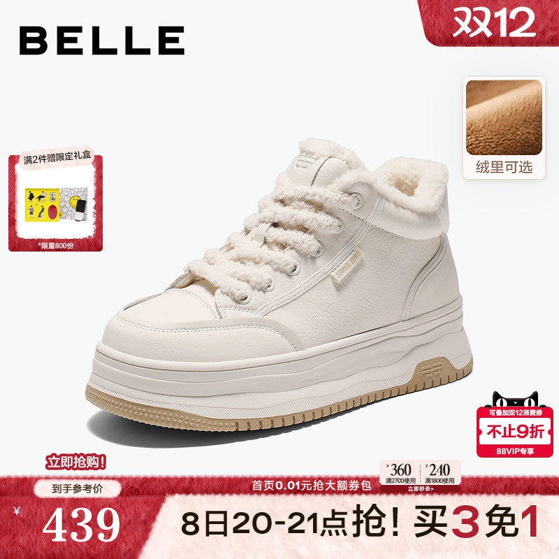 百丽Belle女鞋厚底高帮板鞋24冬季加绒休闲熊猫鞋小白鞋C1Q1DDM4