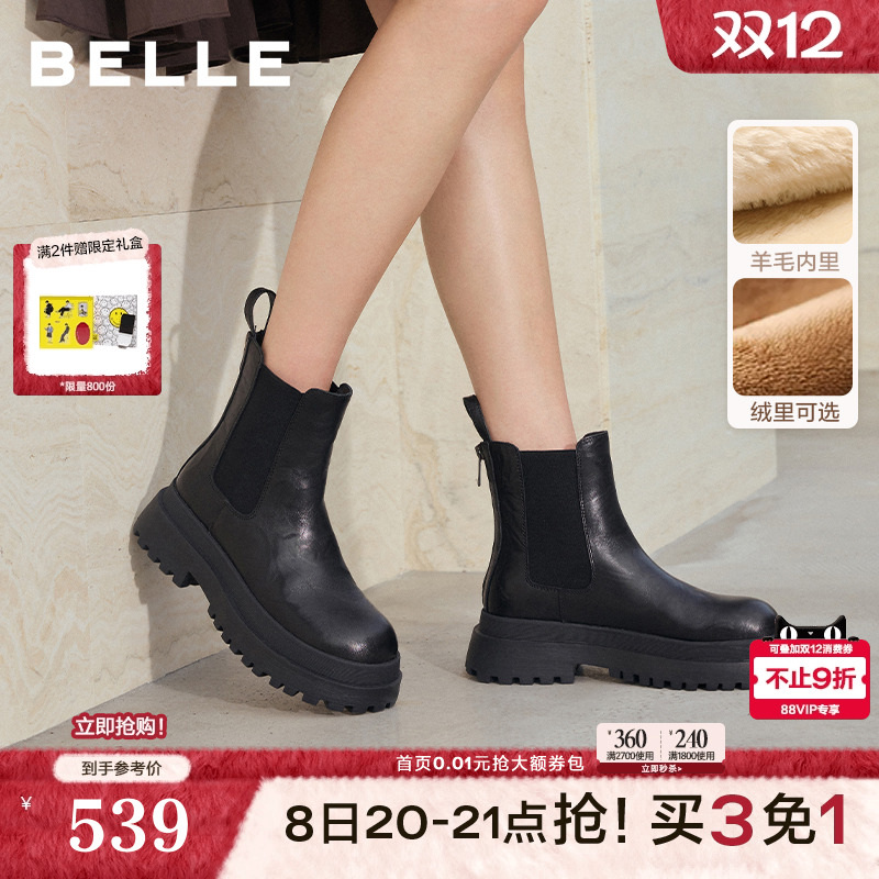 百丽Belle女鞋子24冬季时装靴厚底羊皮切尔西靴短靴女B7D1DDD4