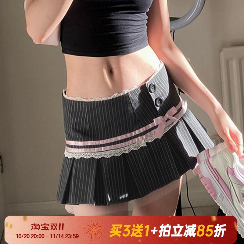 Amyway少女纯欲复古粉色蝴蝶结条纹小众设计百褶西装裙内衬A字裙