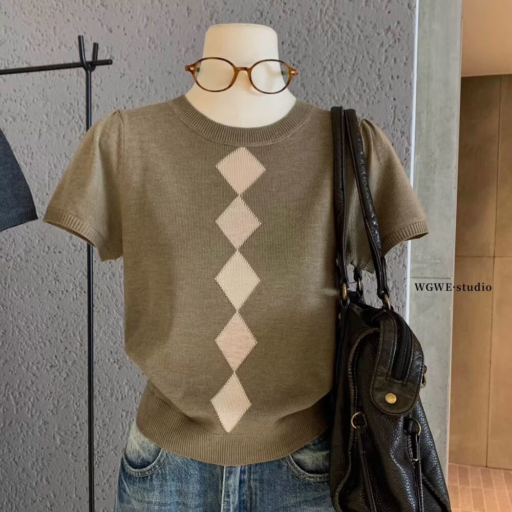 创意款2025秋季复古风文艺套头厚圆领宽松型短袖毛衣女式针织衫