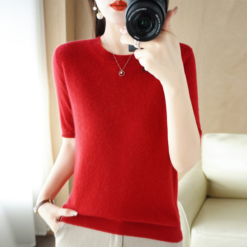 26支双股纱 女士全羊毛金丝短袖针织衫圆领糖果色毛衣 春秋款女装