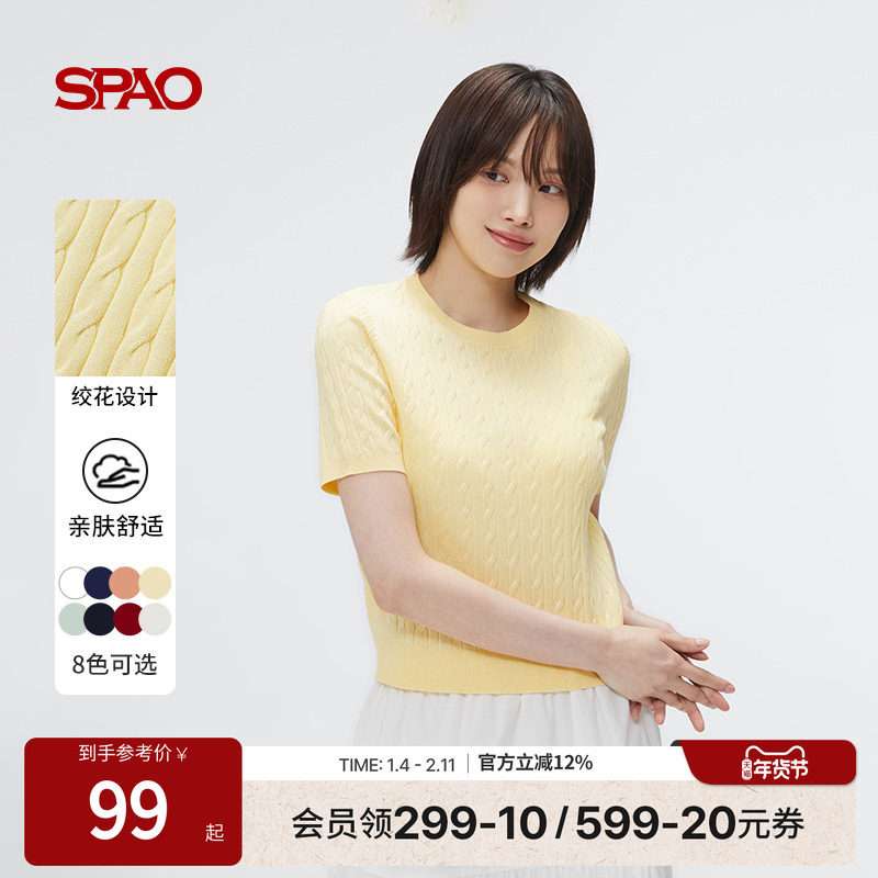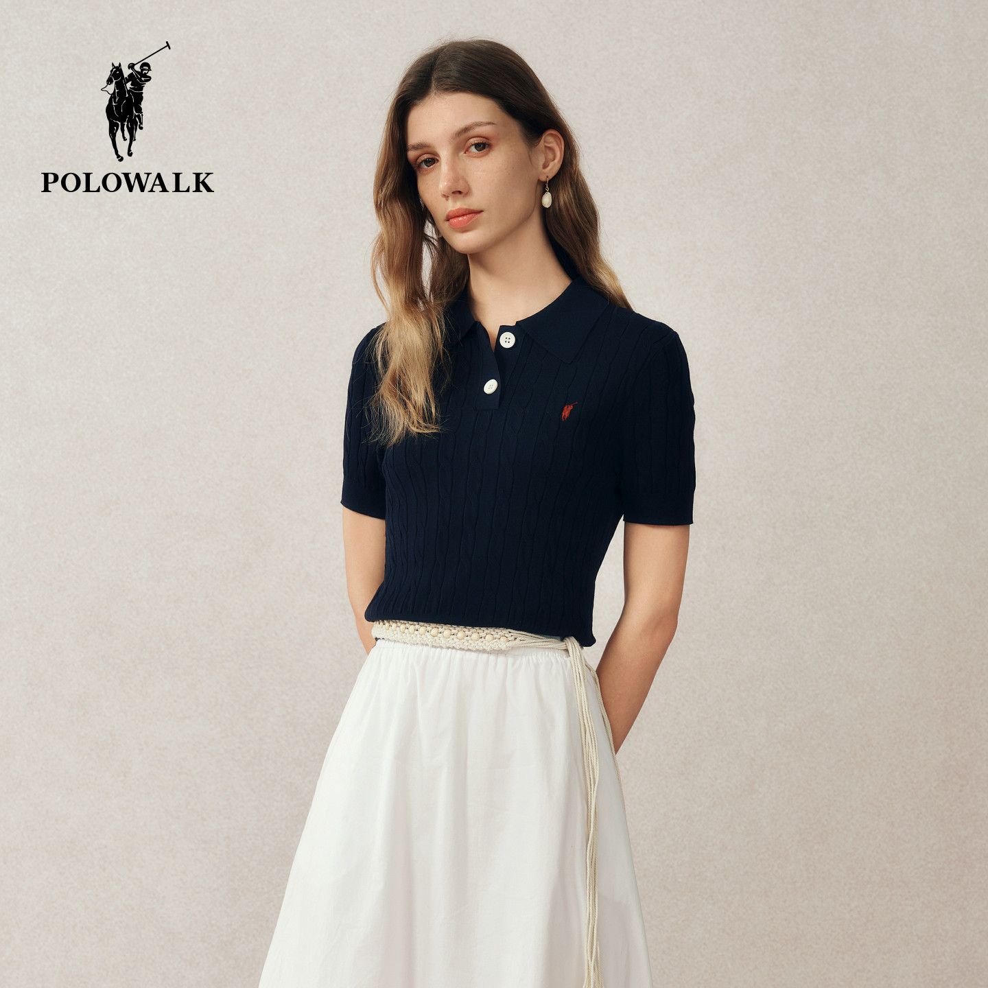 POLOWALK短袖针织衫女式2025夏季新品修身复古绞花毛衣半袖上衣