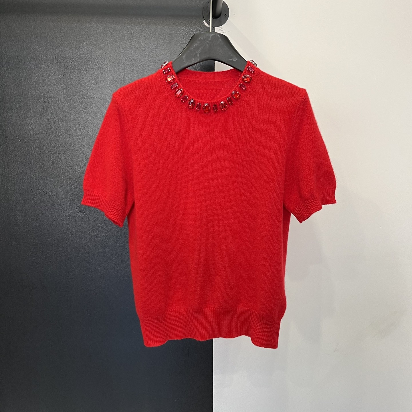 欧货复古风红色短袖绵羊毛衫2026春季钉珠圆领针织衫女士T恤上衣