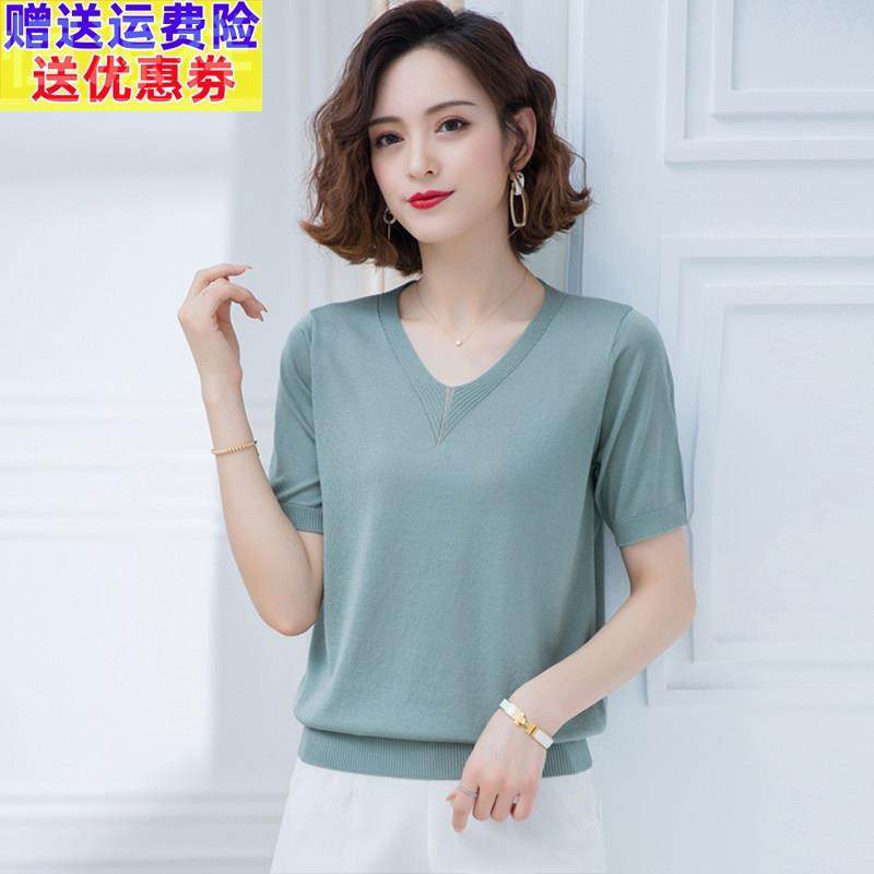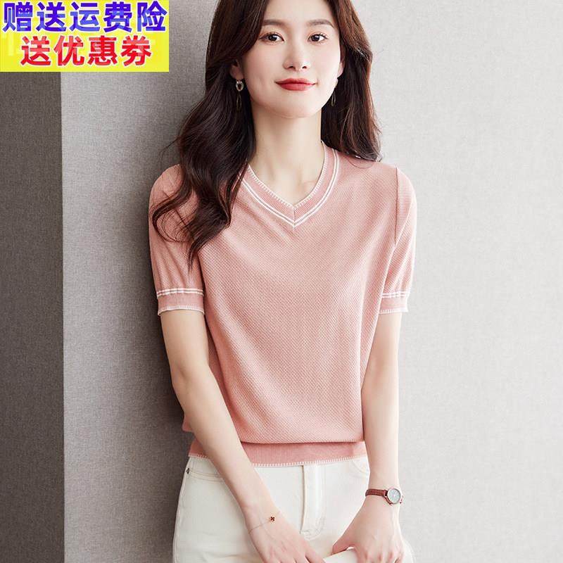 夏季新款V领天丝针织短袖女士薄款套头t恤洋气减龄宽松凉感上衣