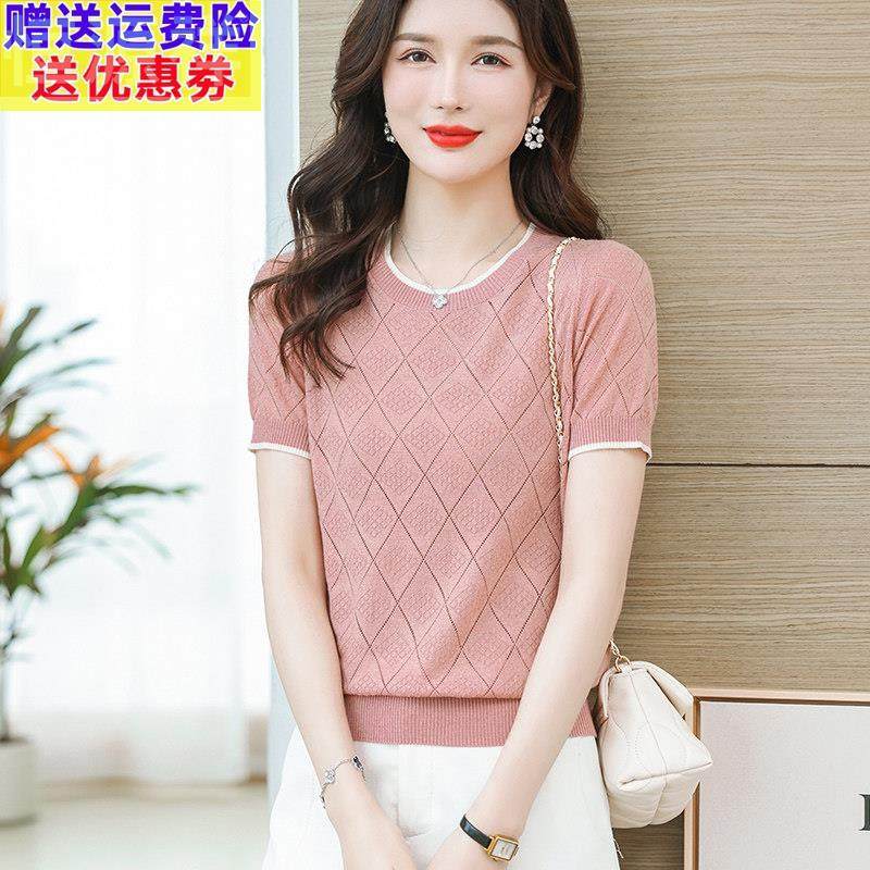 品牌26夏季冰丝女士短袖t恤V领桑蚕丝宽松薄款中年妈妈镂空针织衫