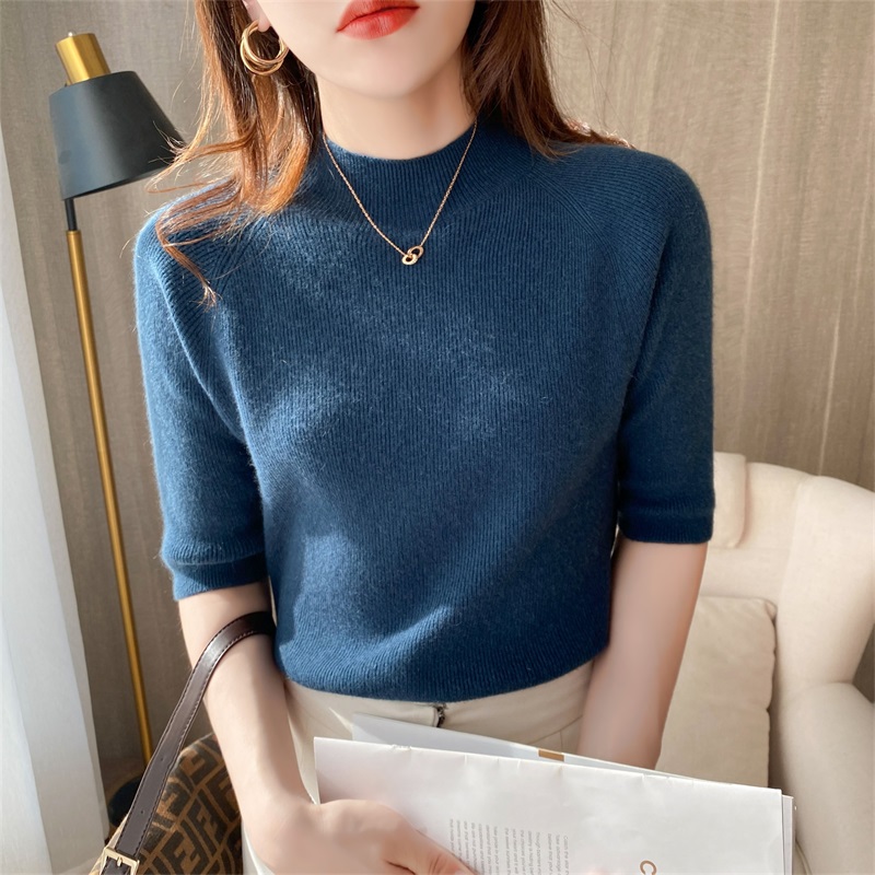 秋季半高领插肩半袖针织短袖毛衣女士打底衫纯色高弹吸汗简约淑女